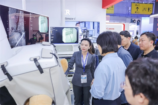 佳能医疗以“全球品质 国智新生”为主题参展,集中展示覆盖CT、磁共振(MR)、血管造影(DSA)、X线(XR)、超声、AI及生化等领域的产品与解决方案。首次实现全线展品实机展示。一系列展品中,国产超高清宽体CT Aquilion ONE /INSIGHT Edition、Vantage Galan / Supreme Edition磁共振、国产Aplio air掌上超声、国产Aplio me超声设备均为CMEF首发,Aquilion Serve SP CT系统迎来中国首展,全面呈现了其“与中国医疗共成长”战略的阶段性进展。据展台工作人员介绍,展台首日接待观众超5000人,以硬核实力收获广泛关注。